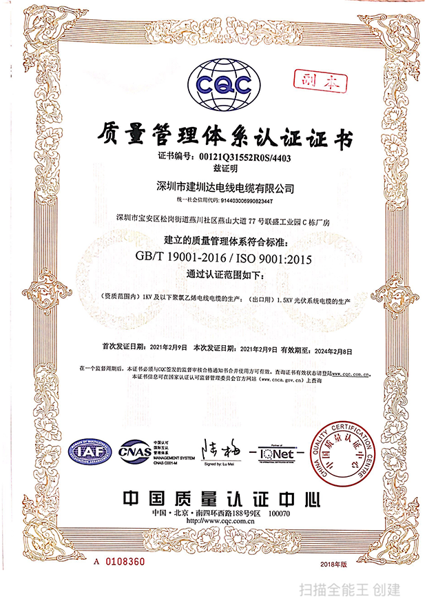 深圳建圳達(dá)電線電纜有限公司,成立于2000年,是一家電線電纜制造商,我們通過了世界各地不同市場的多數(shù)認(rèn)證,如:CCC、RoHS、CB、SAA、TUV、VDE、PSE、BPS、UL、CSA。我們根據(jù)定制產(chǎn)品不斷更新新的認(rèn)證。經(jīng)過數(shù)十年的發(fā)展,我們與來自世界各地的客戶建立了長期的合作關(guān)系。我們曾經(jīng)是菲律賓機(jī)場,,柬埔寨的電力站,美國的醫(yī)院,工廠,埃塞俄比亞的水電站項(xiàng)目。我們是一家值得信賴的電線供應(yīng)商。